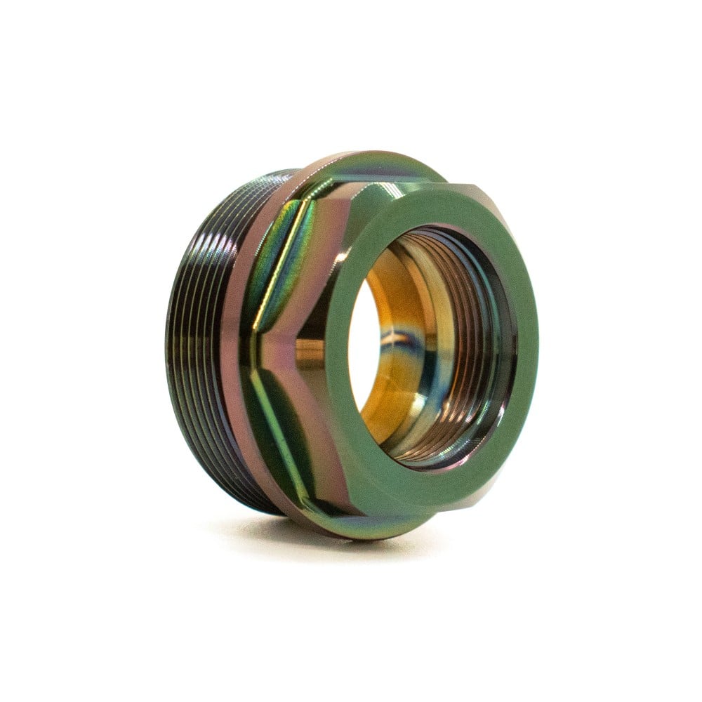 The Rearden ATLAS Bravo Mount with a black rainbow finish, also known as the Atlas GEN 2, is a suppressor mounting system designed for quick attachment and detachment of suppressors with Bravo (1.375×24) threading. It functions as an adapter, allowing users to mount suppressors to muzzle devices using the “Plan B” mounting system, which is also compatible with Q’s Cherry Bomb muzzle device. The ATLAS is a lightweight, low-profile option that minimizes added length and weight to the firearm.